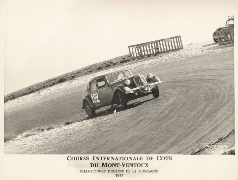 Les fabuleuses accélérations ainsi obtenues pour les courses de côte doivent se concilier avec la possibilité de freiner ; d’où l’utilisation de jantes à rayons pour améliorer le refroidissement des tambours lesquels sont additionnés à l’avant d’une couronne d’aluminium avec ailettes : cause d’abandon dans le Lyon Charbonnières 1958. C’est avec cette Traction Spéciale que Peterson va participer de 1956 à 1957 aux courses les plus mythiques : Lyon Charbonnières _ Mont Ventoux _ Lorraine alsace _ Rallye du Beaujolais. Sa participation en juin 1957 à Montlhéry au Prix de PARIS va lui apporter sa plus belle performance en se classant 1ére en coupe tourisme (toutes cylindrées) et grand tourisme ; |